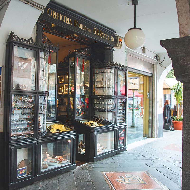 ChiavariL’Oreficeria Rocca nasce nel 1893, quando F. Copello, tornato dall’Argentina, incarica l’artigiano Foppiano, che ha il suo laboratorio in Via Entella, di costruire in Martiri della Liberazione, il famoso carruggio dritto, una oreficeria con le vetrine a scomparsa.